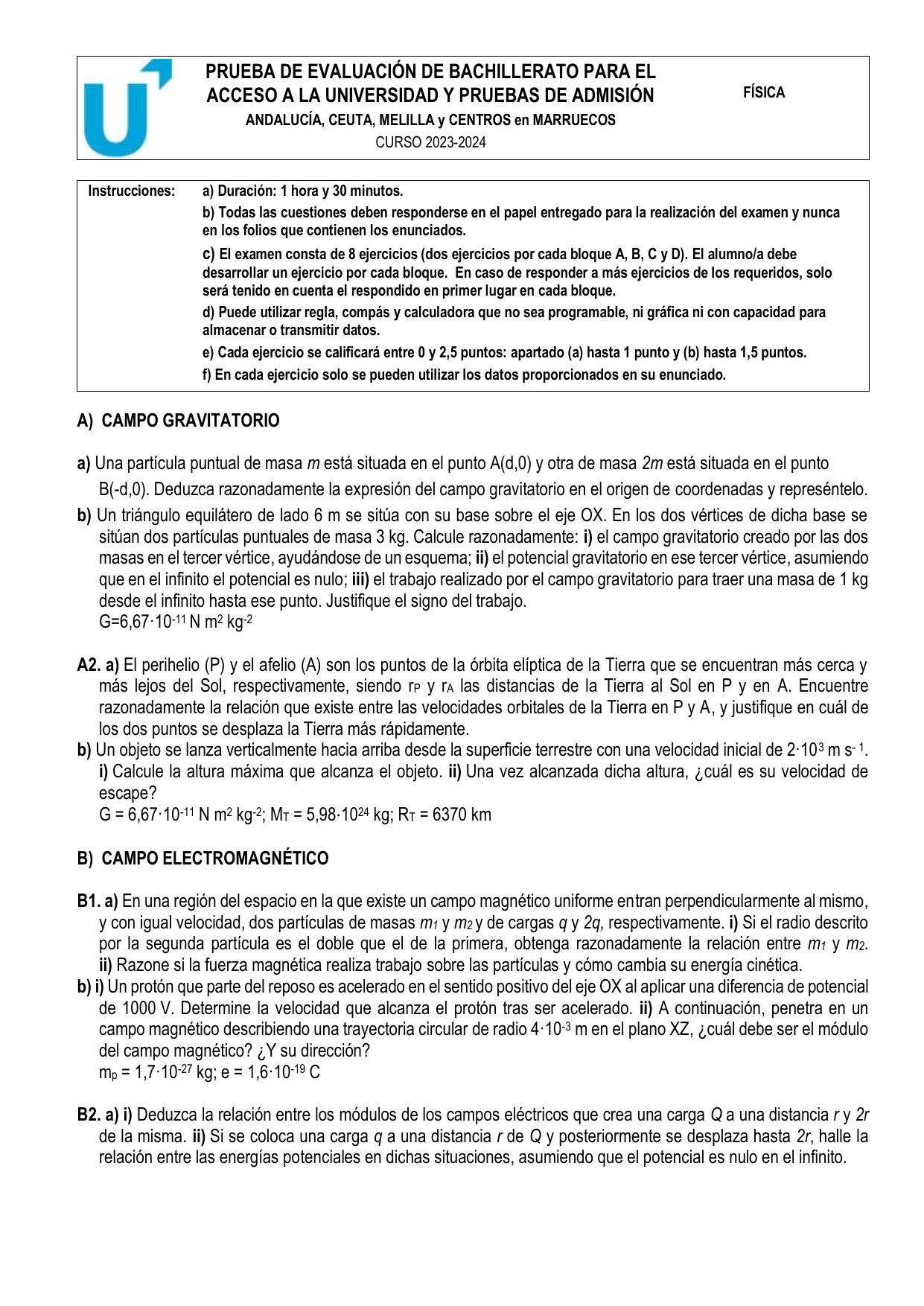 a) Una partícula puntual de masa mm está situada en el punto A(d,0)A(d,0) y otra de masa 2m2m está situada en el punto B(d,0)B(-d,0). Deduzca razonadamente la expresión del campo gravitatorio en el origen de coordenadas y represéntelo.